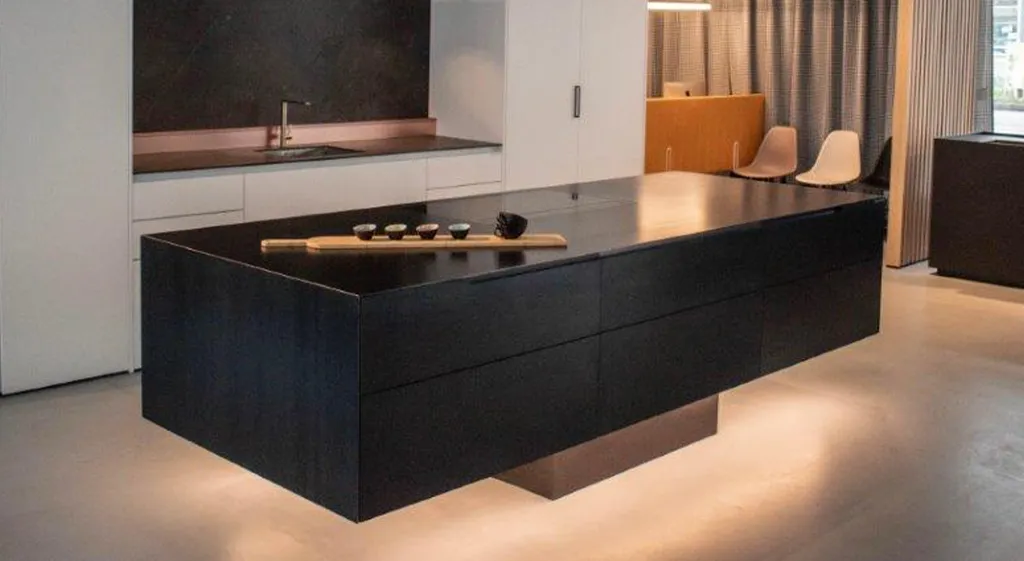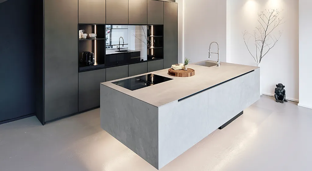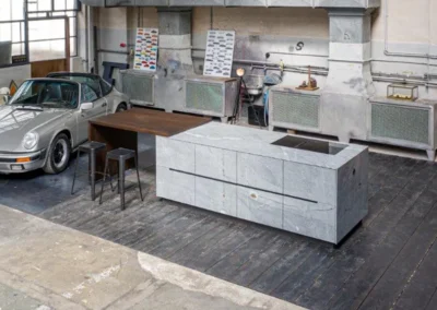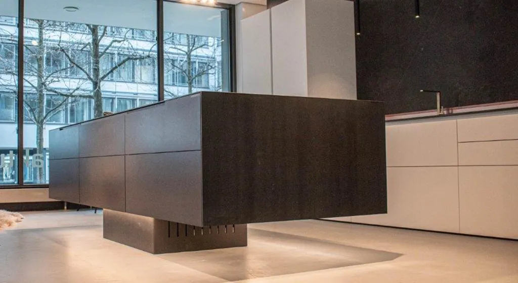 Die scheinbar schwerelose Anmutung verleiht der massiven Küche eine faszinierende Leichtigkeit. Das Herzstück unserer schwebenden Küche ist die Kücheninsel. Sie dient nicht nur als zusätzliche Arbeitsfläche, sondern wurde auch geschaffen, um das soziale Miteinander zu fördern. Mit dieser Innovation bieten wir unseren Kunden ein neues Designelement, das ihrer Küche eine Extraportion an Extravaganz verleiht. Die Verwendung von hochwertigen Materialien wie Hand gespachtelten Beton und Edelstahl macht sie zu einem einzigartigen Blickfang.