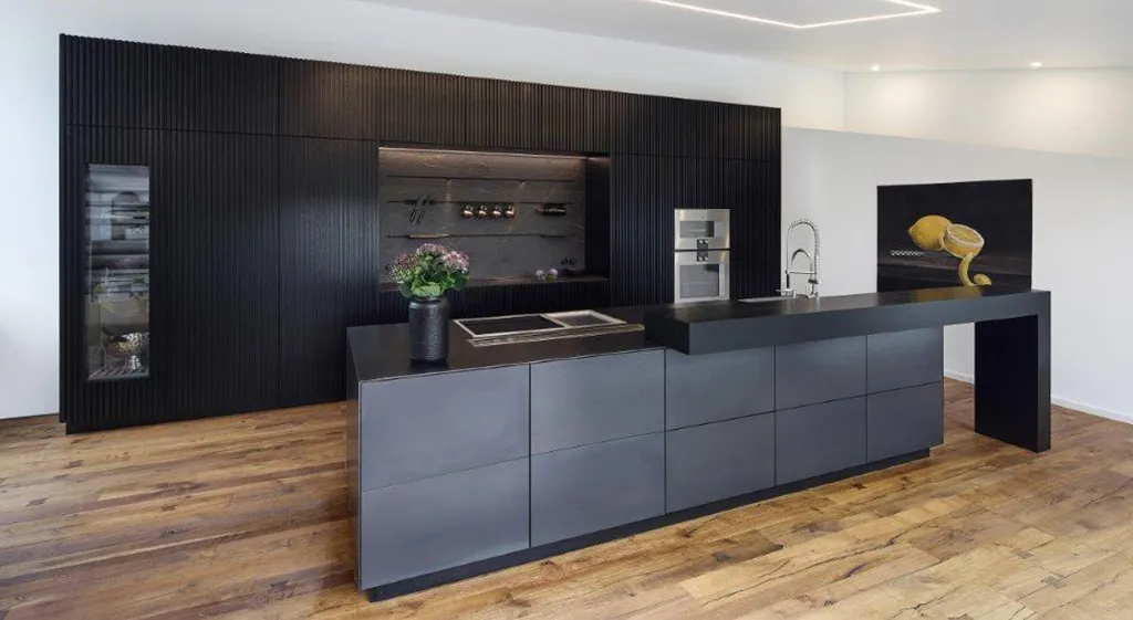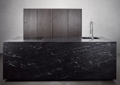 Mit unseren Edelmetallküchen erleben Sie eine perfekte puristische Ästhetik und meisterhafte Handwerkskunst. Edle Metalloberflächen, markante Strukturen und individuell angefertigte Details wie die 3-mm oder auch 19mm Schwarzstahlfront der Kücheninsel oder die einzigartige, hot-rolled Arbeitsplatte prägen das Design. Diese Kombination aus robusten Materialien und klarer Formensprache steht nicht nur für zeitlose Schönheit, sondern auch für unvergleichliche Präzision und Langlebigkeit. Das Resultat ist ein Küchenkonzept, das Ihre höchsten Ansprüche übertrifft und sich als wahres Herzstück Ihres Zuhauses etabliert.